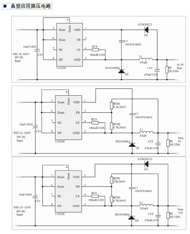 •主要特點:VIN: 12~100V(OUT:ADЛ;集成7A 100V (10A 100V) MOS;集成 180V 高壓啟動電路;多模式控制、無異音工作;支持升壓、降壓和升降壓拓撲;默認14.3V 輸出(FB 腳懸空);待機功耗低于 50mw;良好的線性調整率和負載調整率;集成軟啟動電路;內部保護功能;過載保護 (OLP):逐周期電流限制(OCP);輸出過壓保護(OVP);VDD 過壓、欠壓和電壓箝位保護