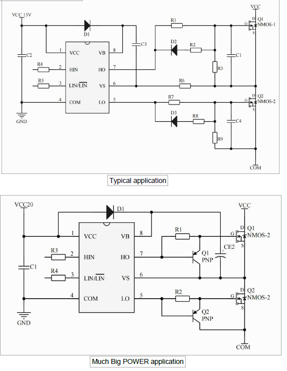 •主要特點:可完全工作到+600V,可耐受負瞬態電壓,抗v /dt,柵極驅動供電范圍從5到20V,欠壓鎖定,3.3V, 5V和15V輸入邏輯兼容,防交叉傳導邏輯,兩個通道的傳播延遲匹配。