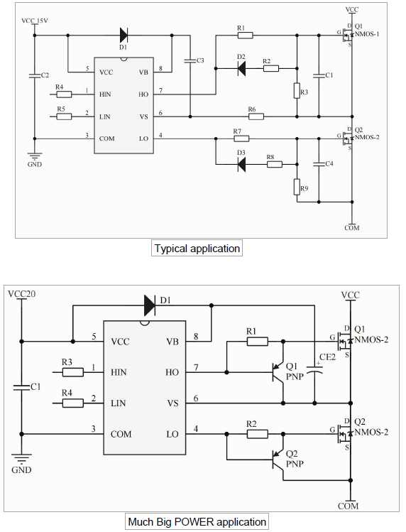 •主要特點:可完全工作到+600V,可耐受負瞬態電壓,抗v /dt,柵極驅動供電范圍從5到20V,欠壓鎖定,3.3V, 5V和15V輸入邏輯兼容,兩個通道的傳播延遲匹配。