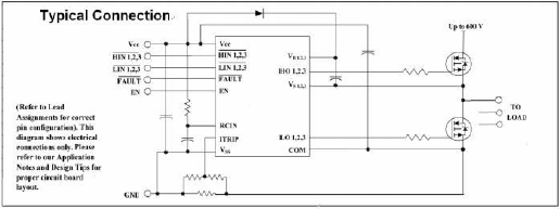 •主要特點(diǎn):浮動(dòng)通道設(shè)計(jì)用于自啟動(dòng)操作,完全工作到+ 600v,可承受負(fù)瞬態(tài)電壓,柵極驅(qū)動(dòng)供電范圍從10v到20v,所有通道欠壓鎖定,過流關(guān)斷關(guān)閉所有六個(gè)驅(qū)動(dòng)器,獨(dú)立的3個(gè)半橋驅(qū)動(dòng)器,所有通道匹配的傳播延遲,交叉?zhèn)鲗?dǎo)防止邏輯,低側(cè)輸出與輸入失相。3.3 V邏輯兼容,低電壓柵極驅(qū)動(dòng),抗噪性更好,外部可編程延遲,故障自動(dòng)清除,所有部件均無鉛